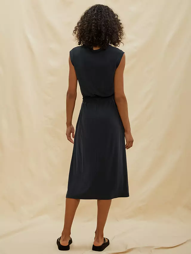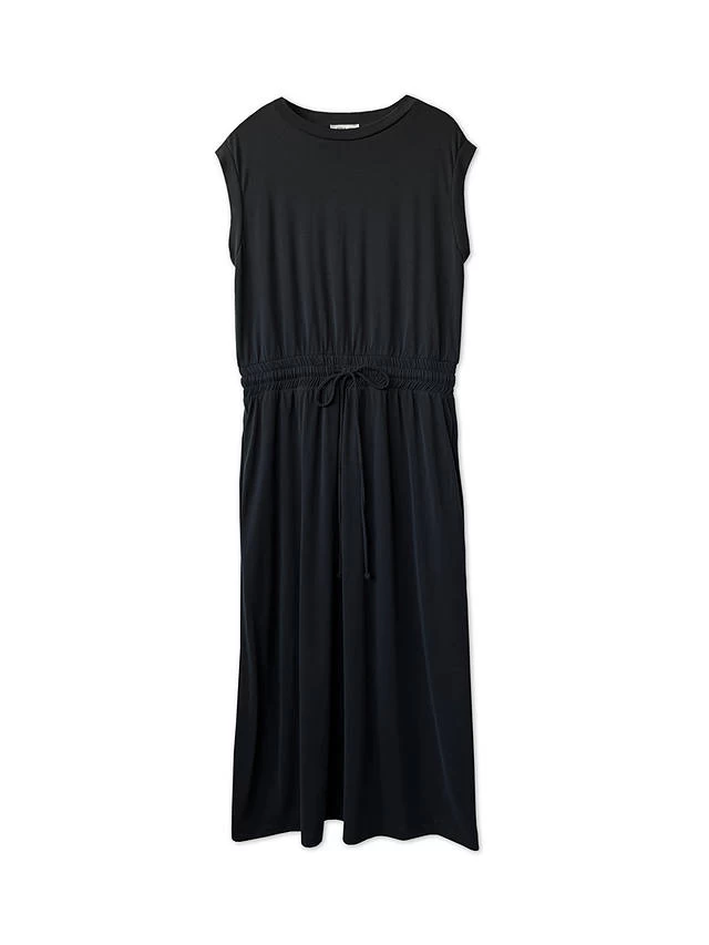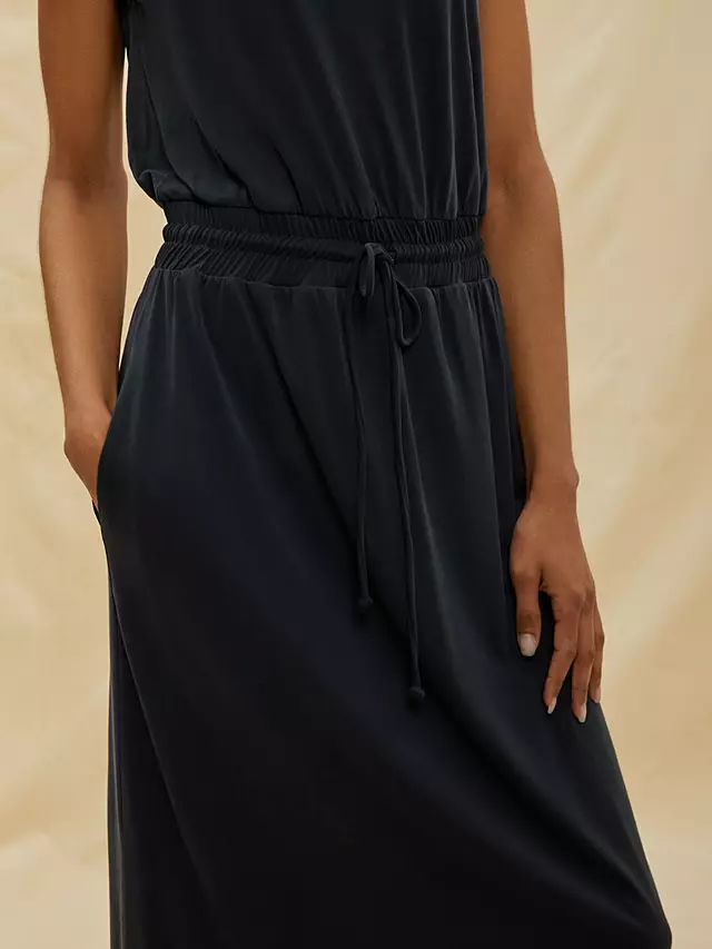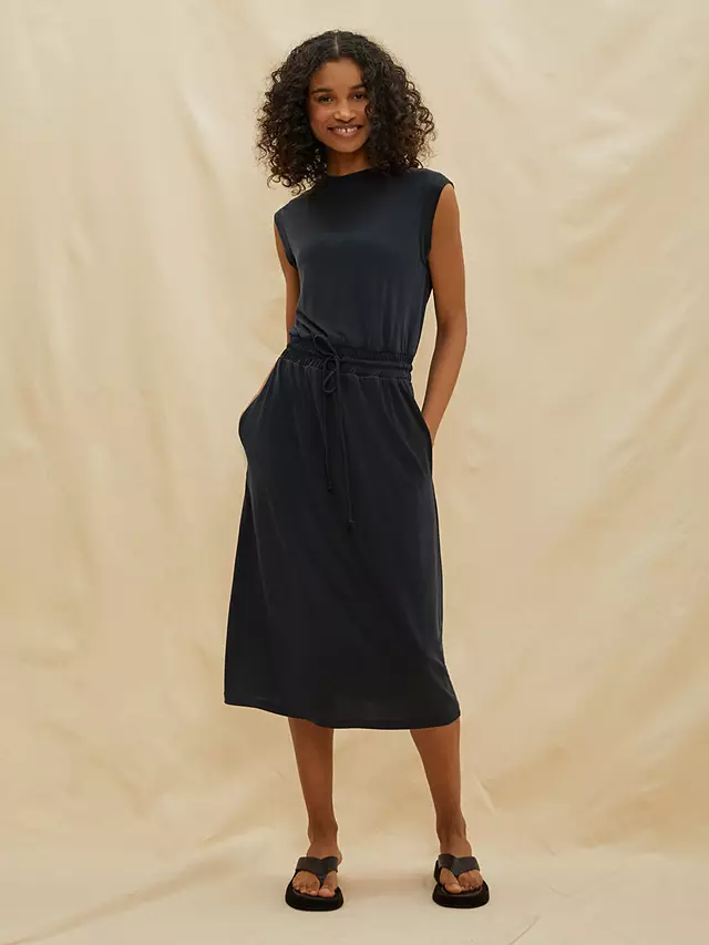 A sleeveless jersey dress with a soft elastic waistband and drawstring. Designed with side pockets, it is crafted from the softest, slinky jersey modal. Easy fitting and very comfortable.