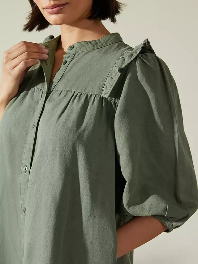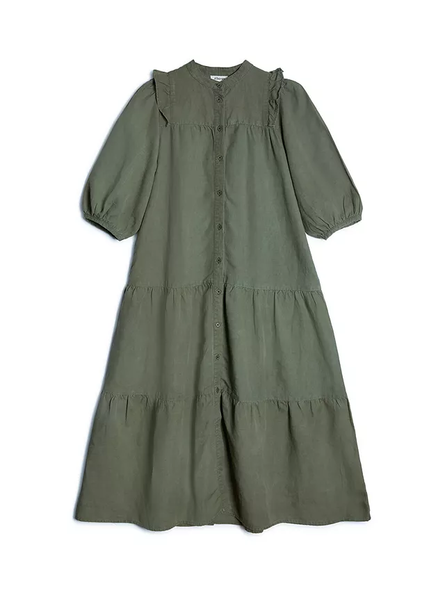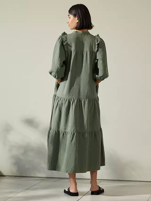 A button through midi dress in a soft linen. A relaxed silhouette designed with a drop waist and tiered skirt. Featuring a ruffle trim over the shoulders and elbow length blouson sleeves. Finished off with deep side pockets.