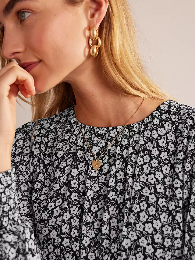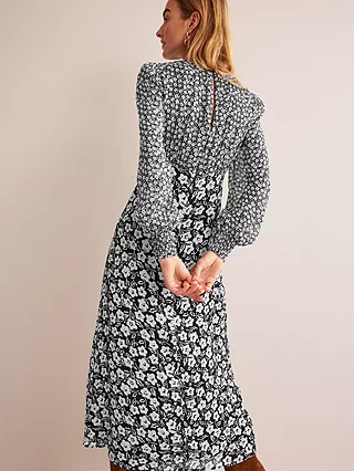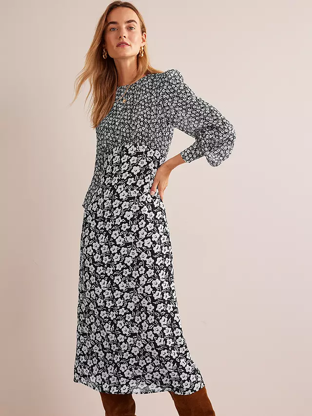 In a charming tea dress shape, this midi dress from Boden is dreamt up from whisper-weight viscose. With a fuss-free round neckline and full-length sleeves, this style is adorned with a blooming flower print.
