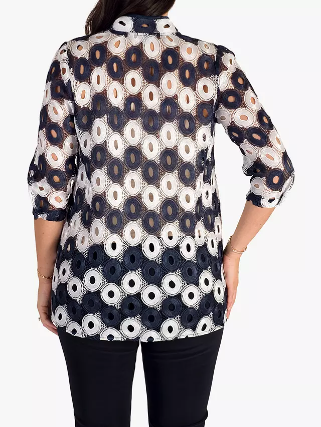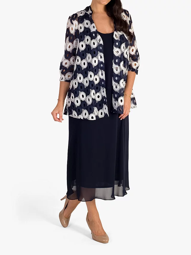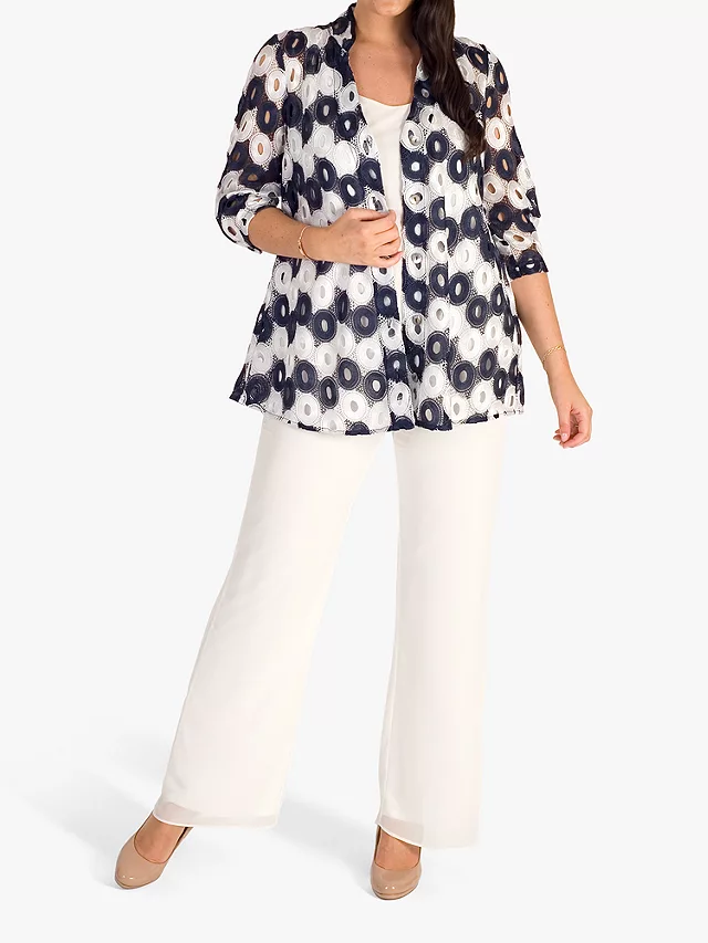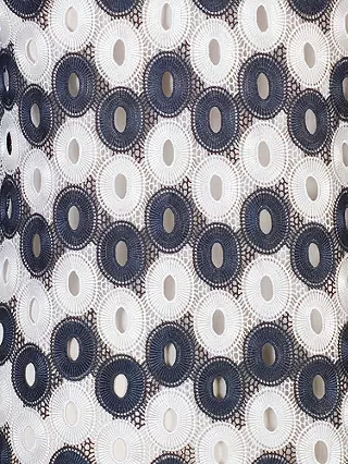 This ivory and navy A-line jacket from chesca has a pretty all over Gupiere lace circle design.