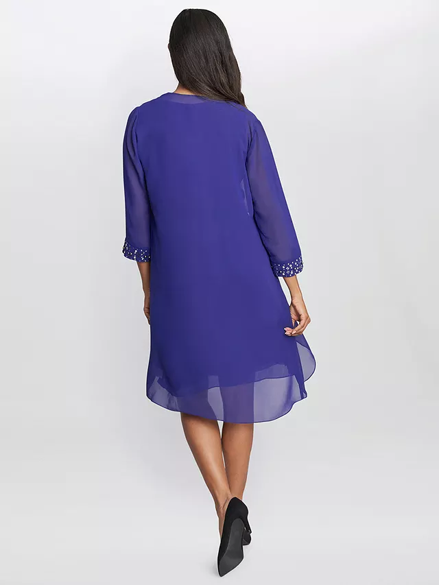 An open-front jacket lends soft texture to this short chiffon dress, while beading at the neckline adds a hint of shine. A classic ensemble!
