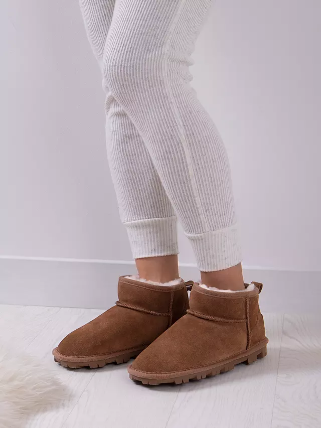 These mini slipper boots from Just Sheepskin are fashioned from genuine suede leather with warm sheepskin lining for long-lasting quality and comfort. They feature a textured slip-resistant chunky outdoor sole, DREAM step gel-infused memory foam for comfort, and J.U.S.T GUARD technology for built-in water resistance.