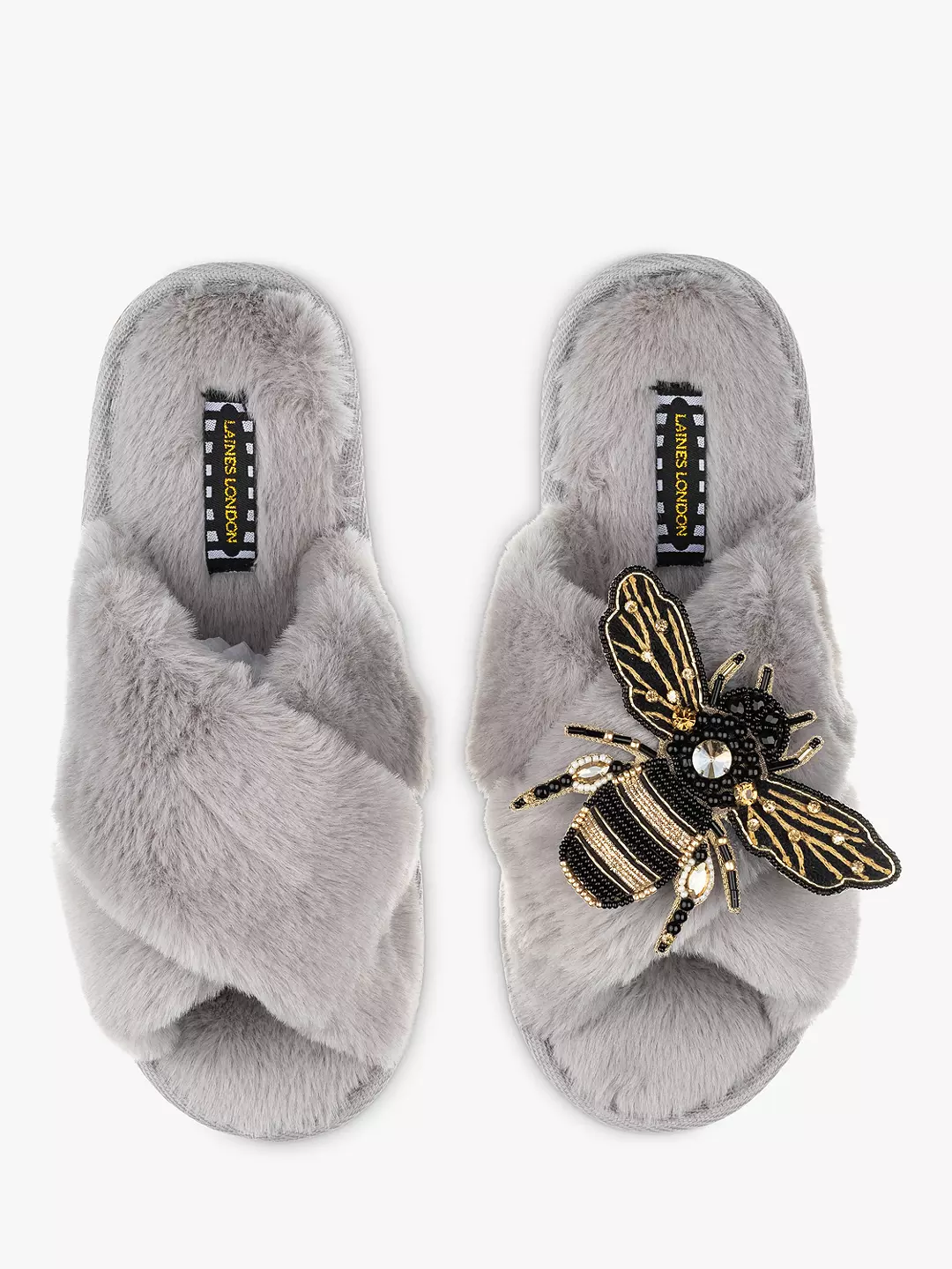 Treat your feet to these snuggly, fluffy faux fur slippers decorated with a stunning artisan brooch.