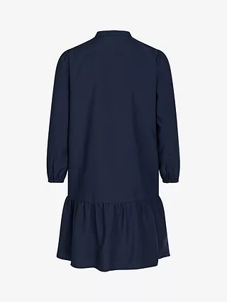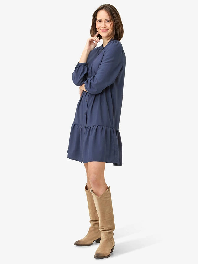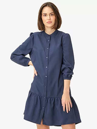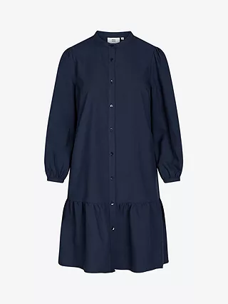 This soft, cotton blend shirt dress features a collar band at the neckline and a button-down front. It also includes pockets, slim cuffs and low peplum details at the bottom hem.