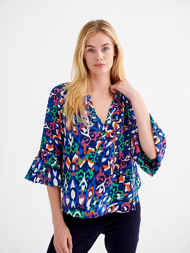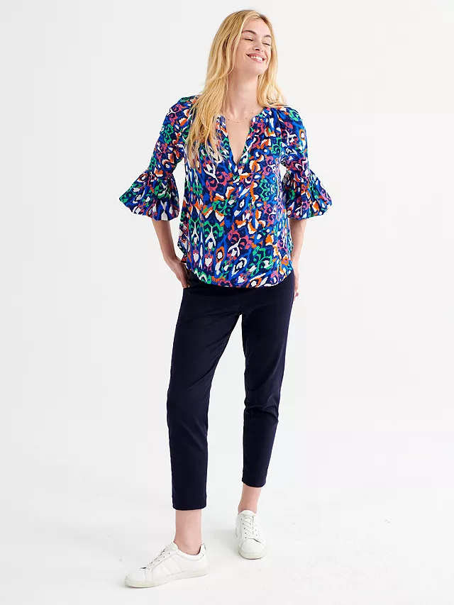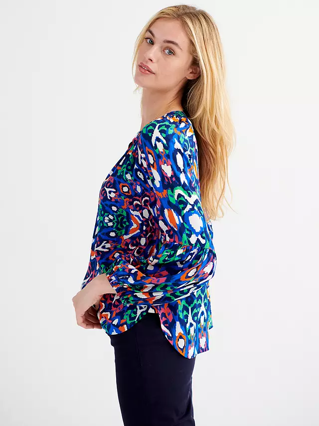 Style and comfort combined, an easy silhouette with a flattering v-neckline, cut in soft-washed silk. Simple, but with spectacular gathered sleeves not to mention the exclusive, colourful feather print boasting tones of greens, blues, pinks, and oranges. Push the easy elasticated cuff up to your elbows for a fluted sleeve look. Loose fitting, whether worn tucked in or tunic style – ready to be styled up or down whatever the moment.